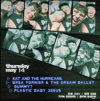 LIVE SHOW! Brea Fournier & the Dream Ballet, Kat and the Hurricane, Gummy?, Plastic Baby Jesus Thursday, May 14, 2026 7:00 PM 11:00 PM Google Calendar ICS TICKETS HERE
